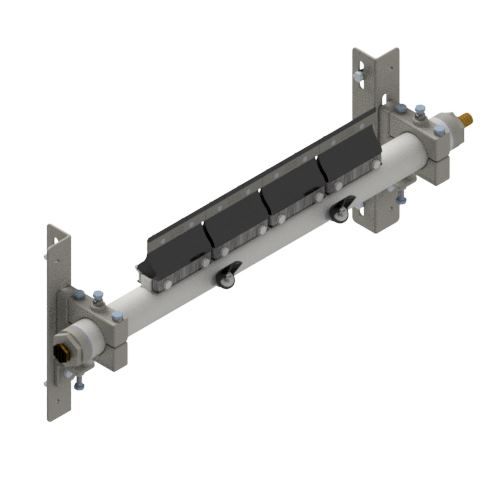TUFF R Spray Secondary Belt Cleaners deliver effective long term cleaning with minimal maintenance. Independent shock absorbing cushions provide constant tensioning to the high grade tungsten tips that will individually self-adjust to irregular contours of belt surfaces. Poles have incorporated spray jets allowing the introduction of water to help dislodge carry back fines embedded into the belt's surface and to lubricate cleaner tips or blades. Significant increases in cleaner performance and life will be delivered when water sprays are utilised. Spray jets are angled at 45 degrees to the belt for a high pressure, low volume spray. It is recommended that a TUFF Water Control Board be utilised for optimum control and filtration. Also available in Reinforced Spray Pole and Custom Built models. A range of cushions, tips and spray jet sizes are available for different applications including vulcanised and mechanical spliced belts. Suitable for Reversing Belts in underground, hard rock and metal mining, aggregate, bulk material handling, and wood products operations. Maximum Belt Speed - 6 m/sec. Water consumption 7.8 ltr/m @ 3 bar with Size 10 Jets