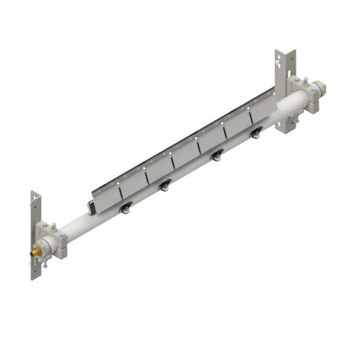 TUFF P Spray Secondary Belt Cleaners deliver effective long term cleaning with minimal maintenance. Independent shock absorbing cushions provide constant tensioning to the high grade tungsten tips that will individually self-adjust to irregular contours of belt surfaces. Poles have incorporated spray jets allowing the introduction of water to help dislodge carry back fines embedded into the belt's surface and to lubricate cleaner tips or blades. Significant increases in cleaner performance and life will be delivered when water sprays are utilised. Cushions are angled back to form a very safe non aggressive position to the belt while the tip attack angle remains at 90 degrees. Spray jets are angled at 45 degrees to the belt for a high pressure, low volume spray. It is recommended that a TUFF Water Control Board be utilised for optimum control and filtration. Also available in Reinforced Spray Pole and Custom Built models. A range of cushions, tips and spray jet sizes are available for different applications including vulcanised and mechanical spliced belts. Suitable for underground, hard rock and metal mining, aggregate, bulk material handling, and wood products operations. Maximum Belt Speed - 6 m/sec. Water consumption 15.6 ltr/m @ 3 bar with Size 10 Jets Not suitable for Reversing Belts - refer to TUFF R or TUFF Line Belt Cleaners for this application.